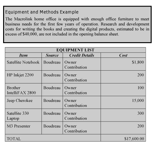 - To complete this Element you will need to gather information related to all equipment required to operate as well as the costs and the methods used to acquire the items (purchase, rent, or lease).