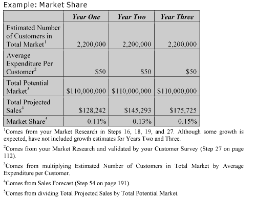 - For each year, divide your Total Projected Sales by the Total Potential Market to arrive at your market share percentage.